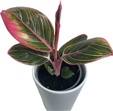 A calathea with broad green leaves pinstriped with slashes of pink. Distinguished from Calathea Ornata by its lighter green leaves.