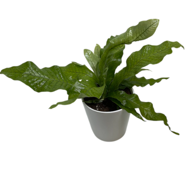 A fern with wide, flat lobes that split into fronds like hanging ribbons at maturation.